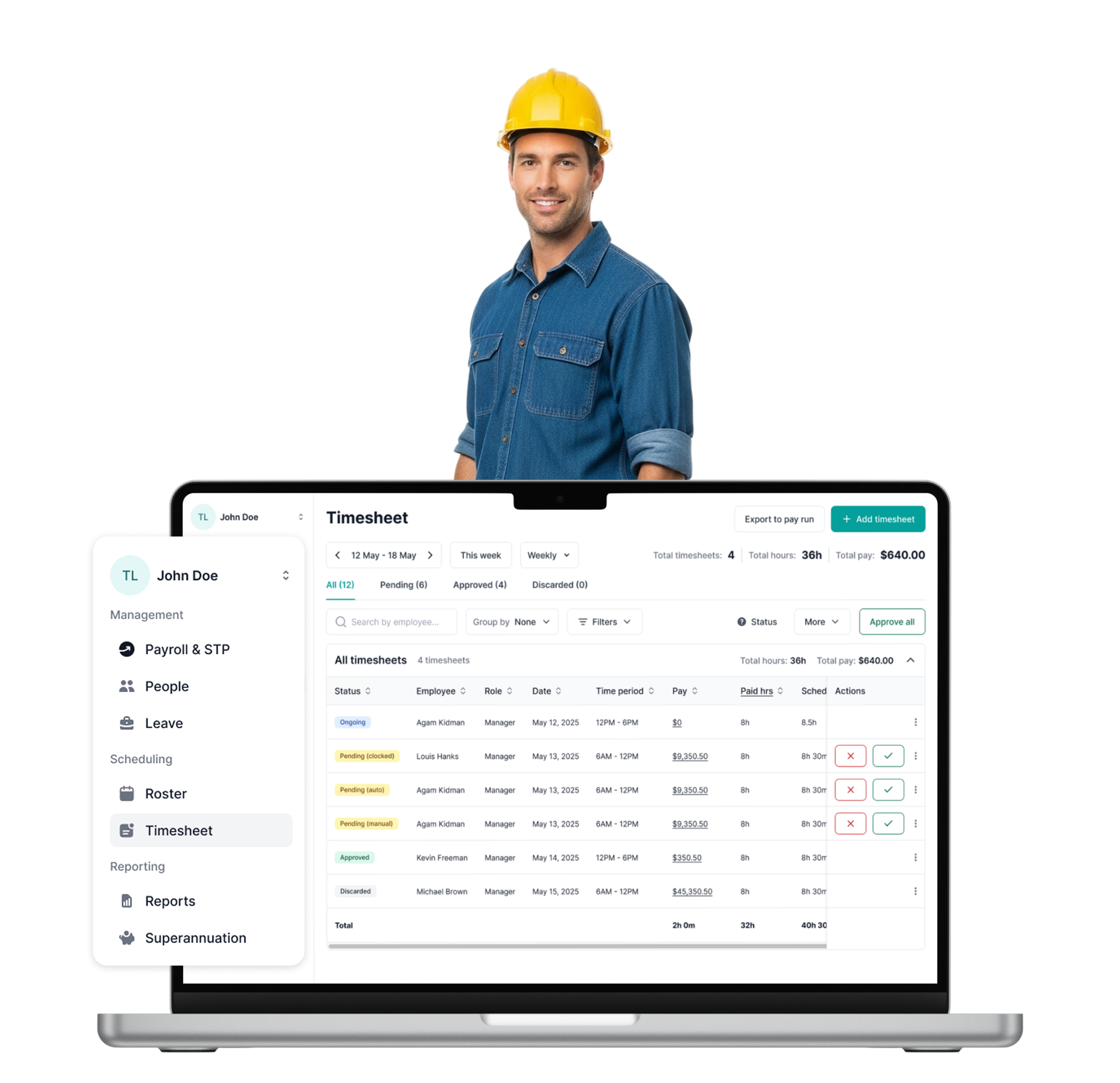 Engineering projects run on tight labour budgets. Payroller gives project managers a live view of all submitted and approved timesheets across the team from a single dashboard.